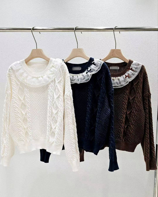 12B213 點點蕾絲麻花紋毛衣