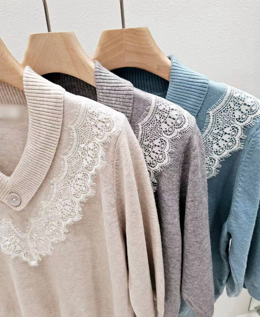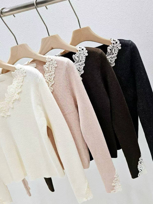 12B211 布蕾絲V領螺紋針織衫