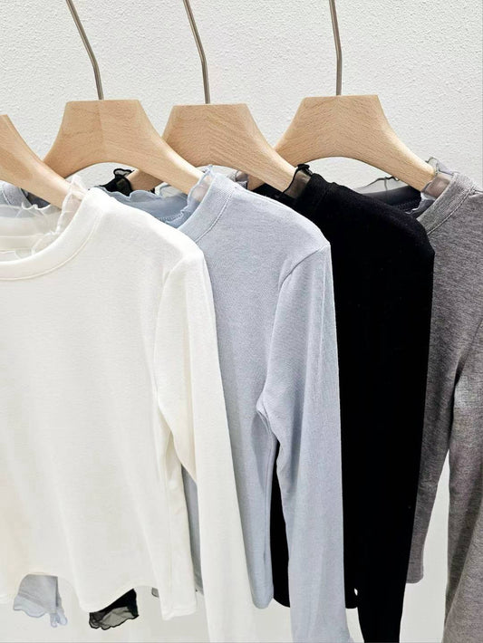 12B202 拚紗木耳邊立領彈性棉長袖T