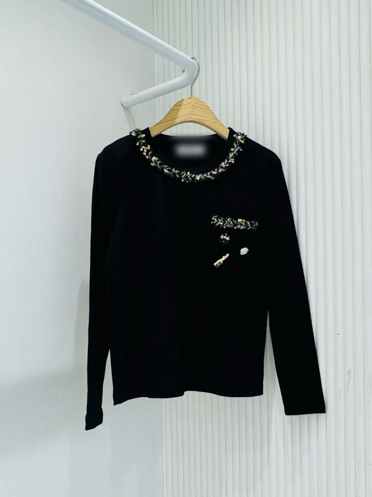 12B109 麻花亮片領口袋長袖精梳棉T