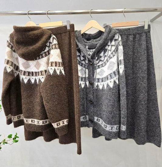 12A205 圖騰連帽牛角扣外套+A字裙毛料套裝