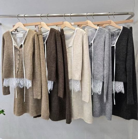 12A204 蕾絲假兩件外套+A字裙針織套裝