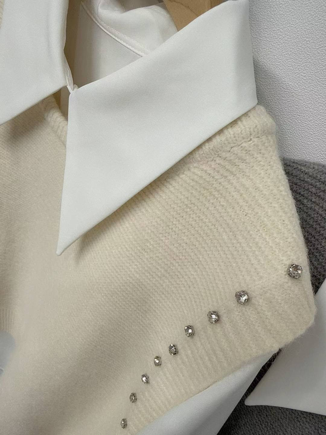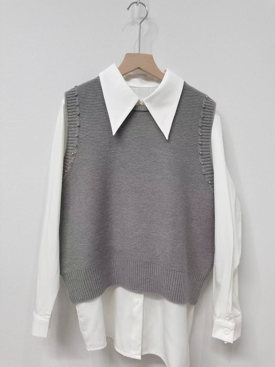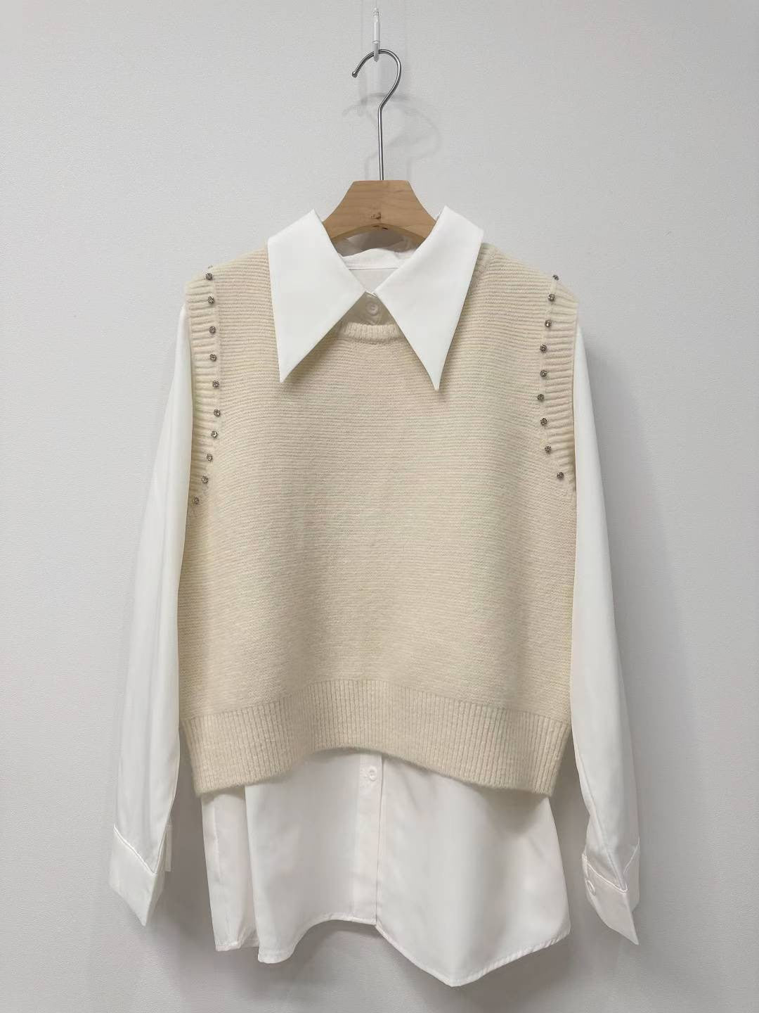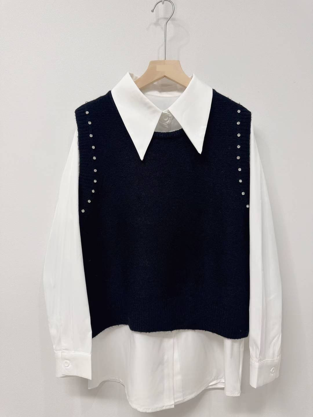 10D103 白襯衫+水鑽針織背心 套裝