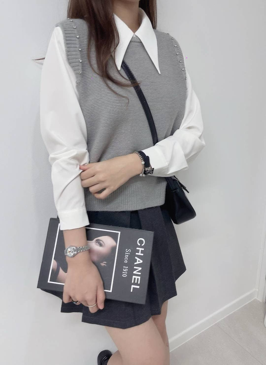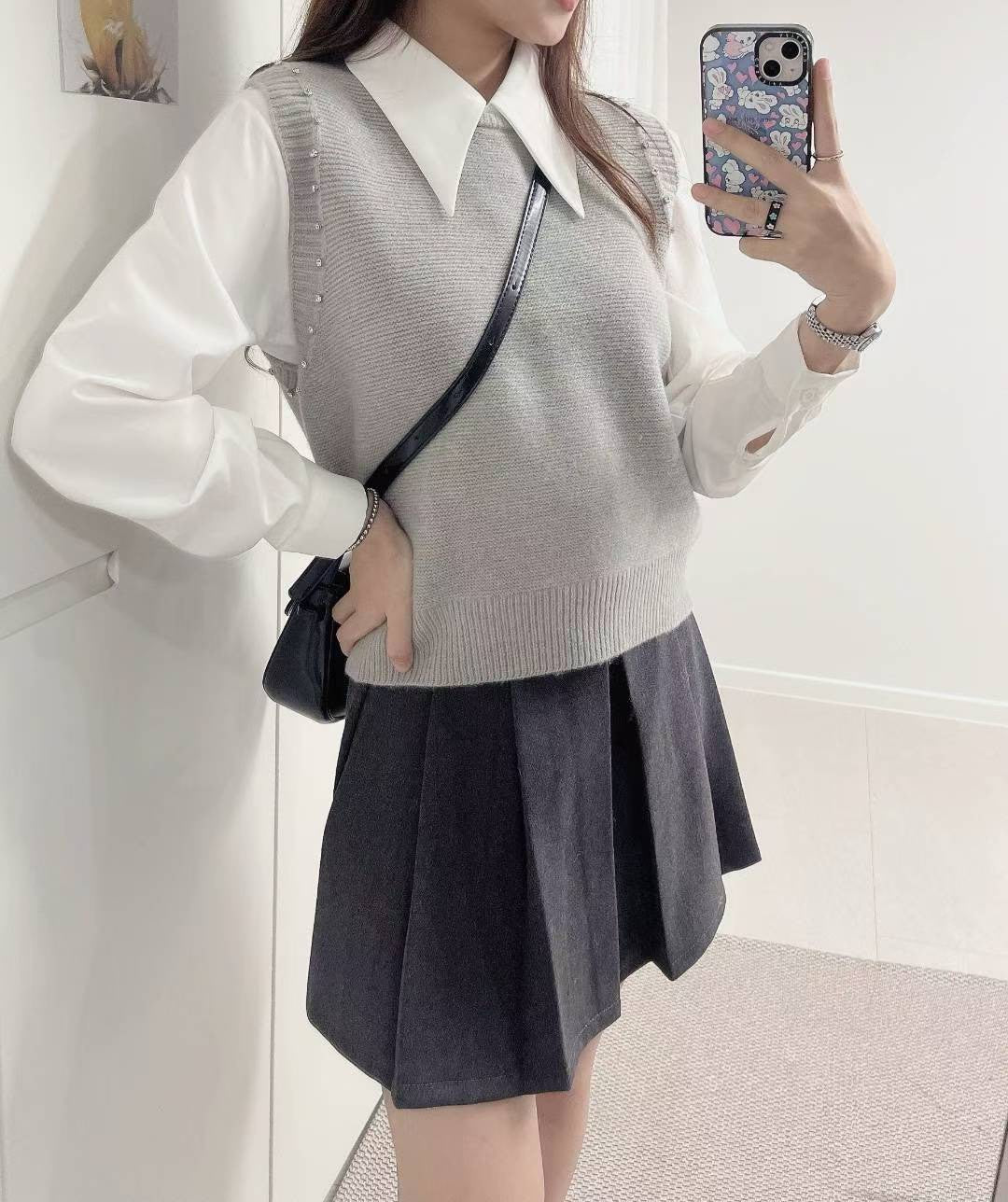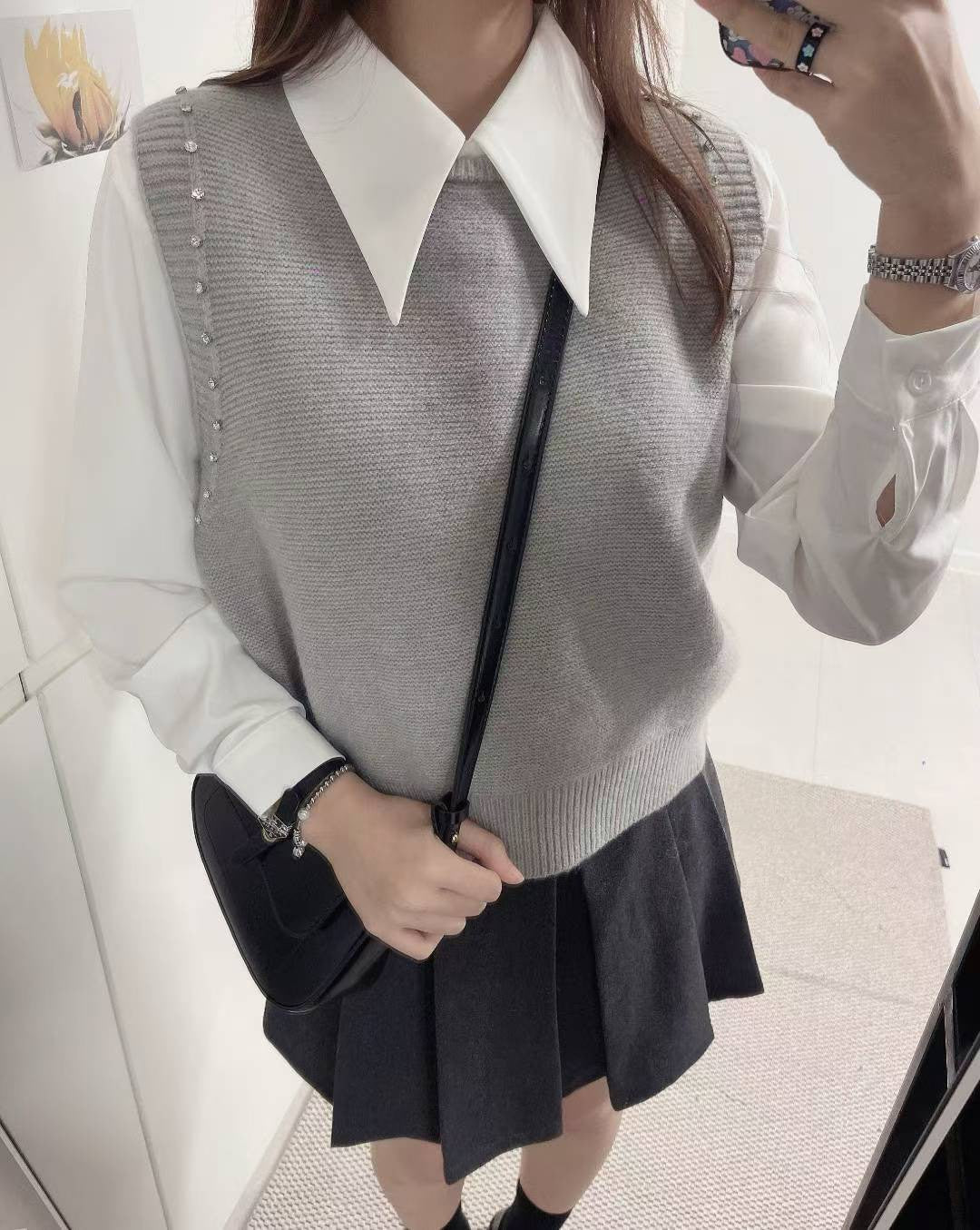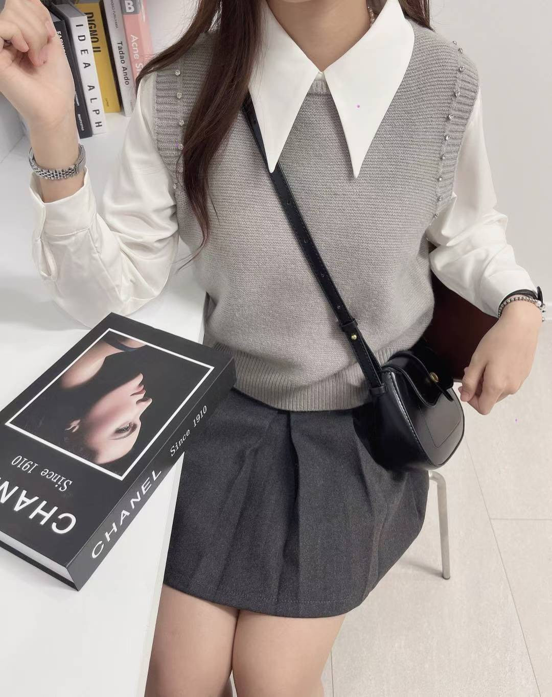 10D103 白襯衫+水鑽針織背心 套裝