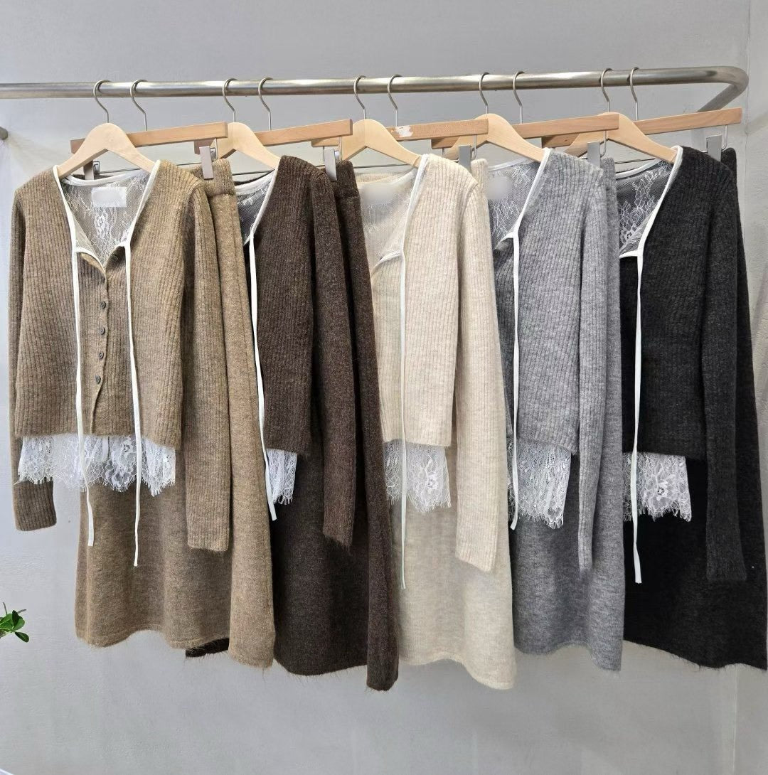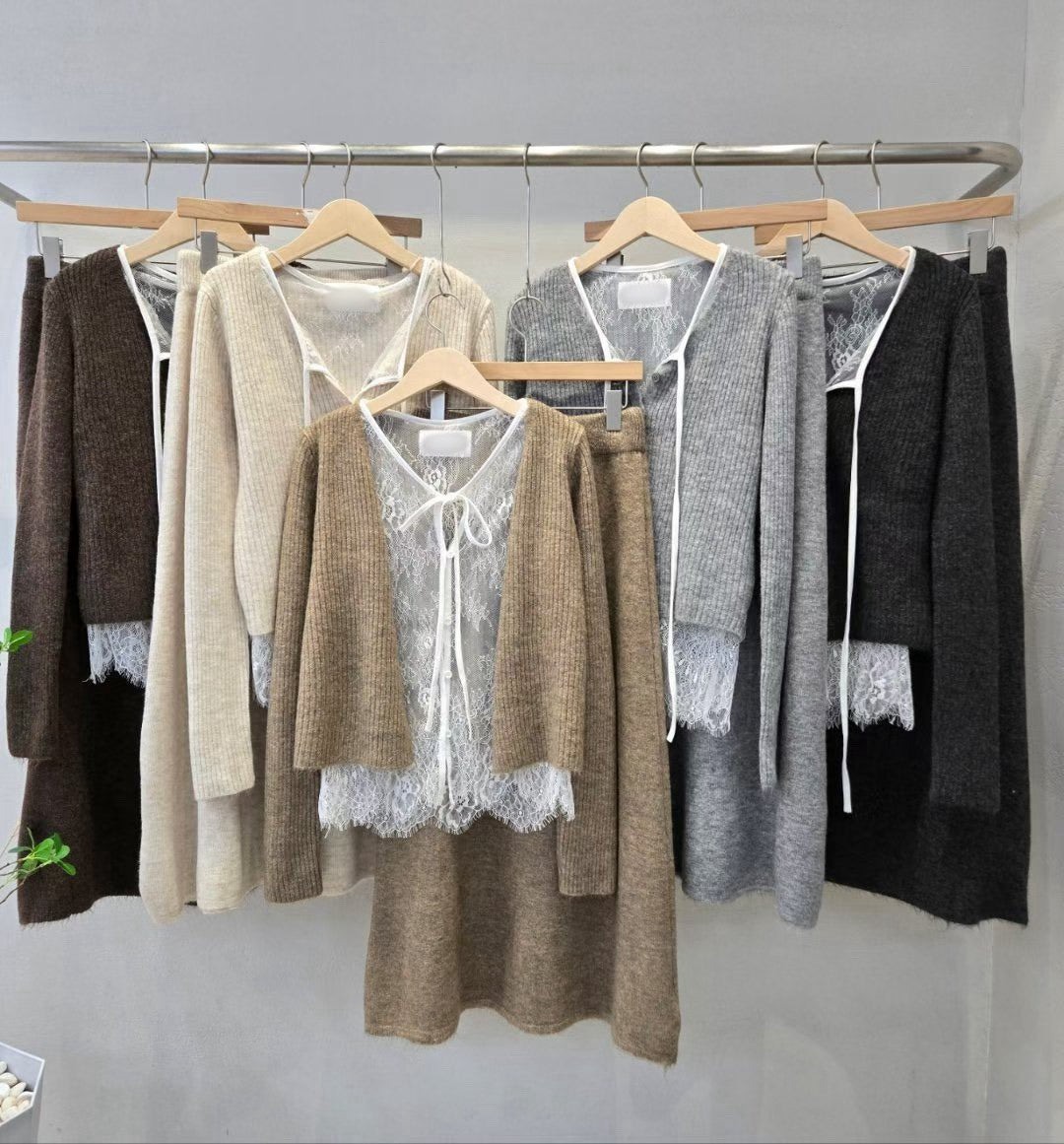 12A204 蕾絲假兩件外套+A字裙針織套裝