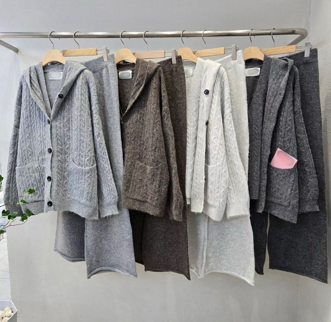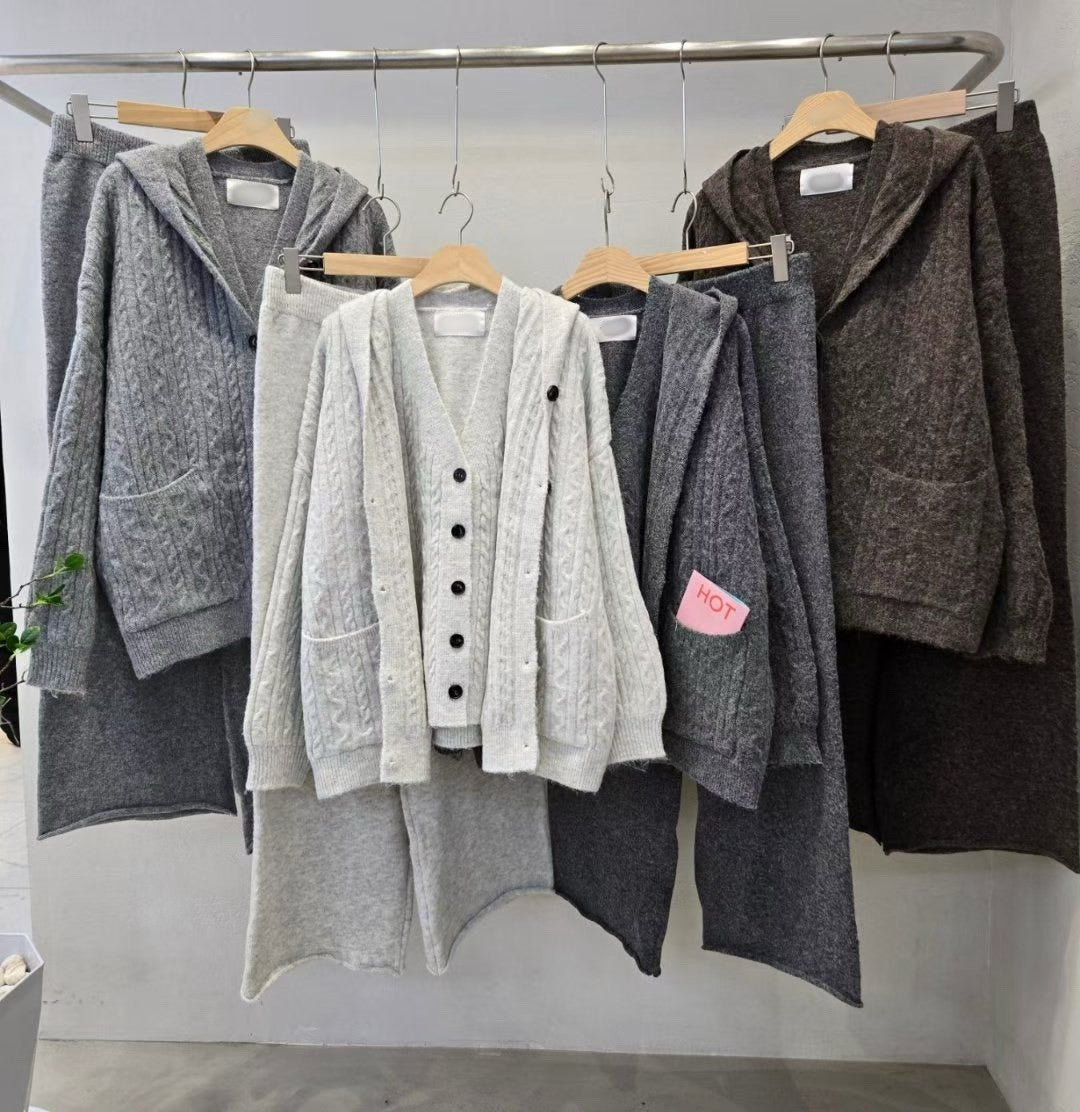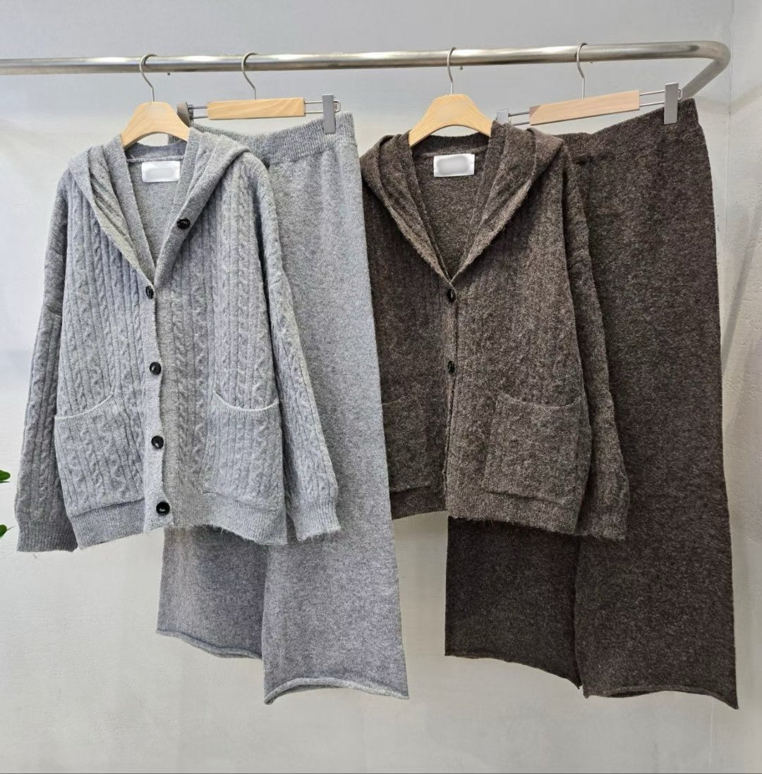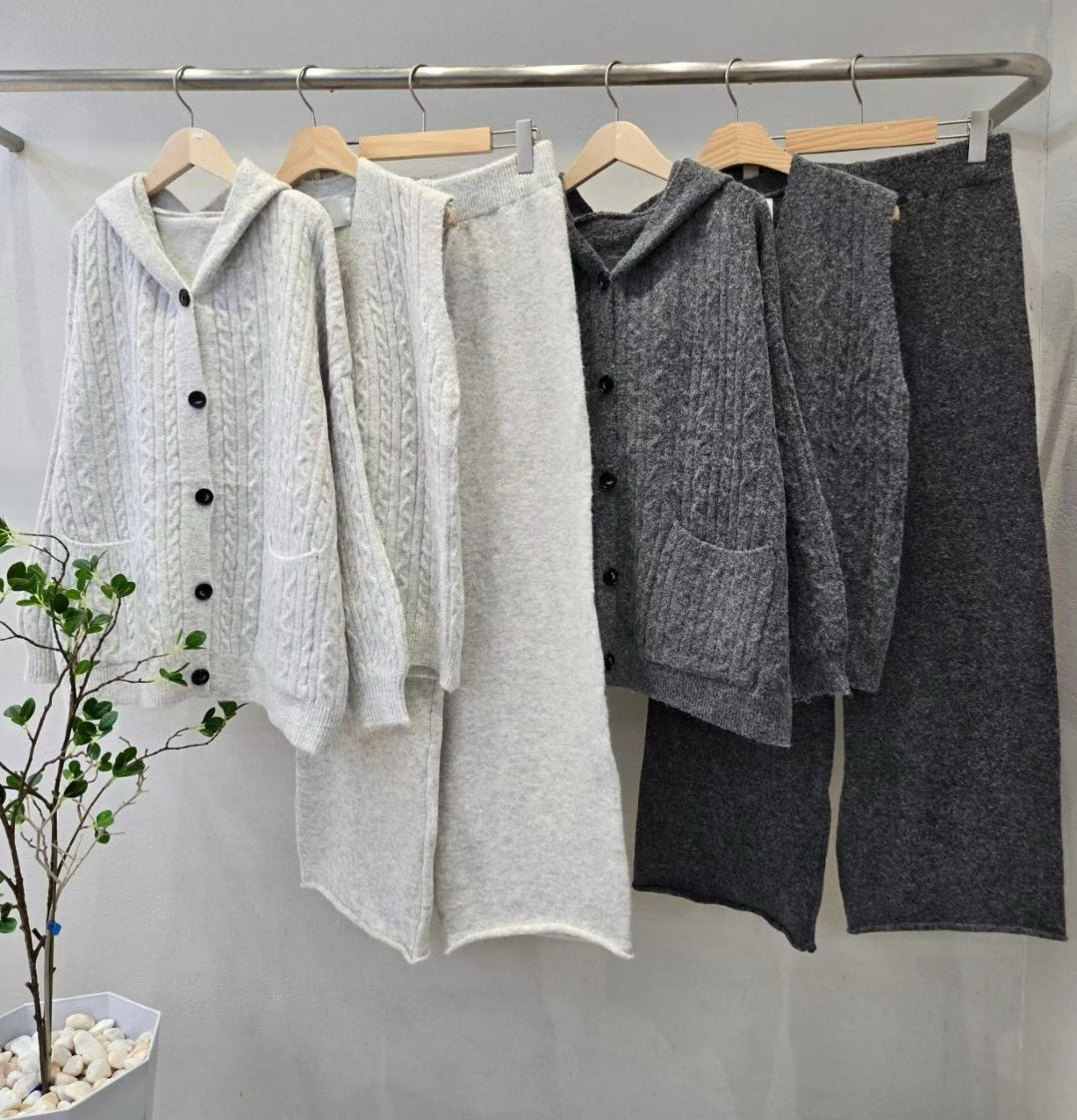 12A206 麻花紋連帽外套+背心+長寬褲毛料套裝