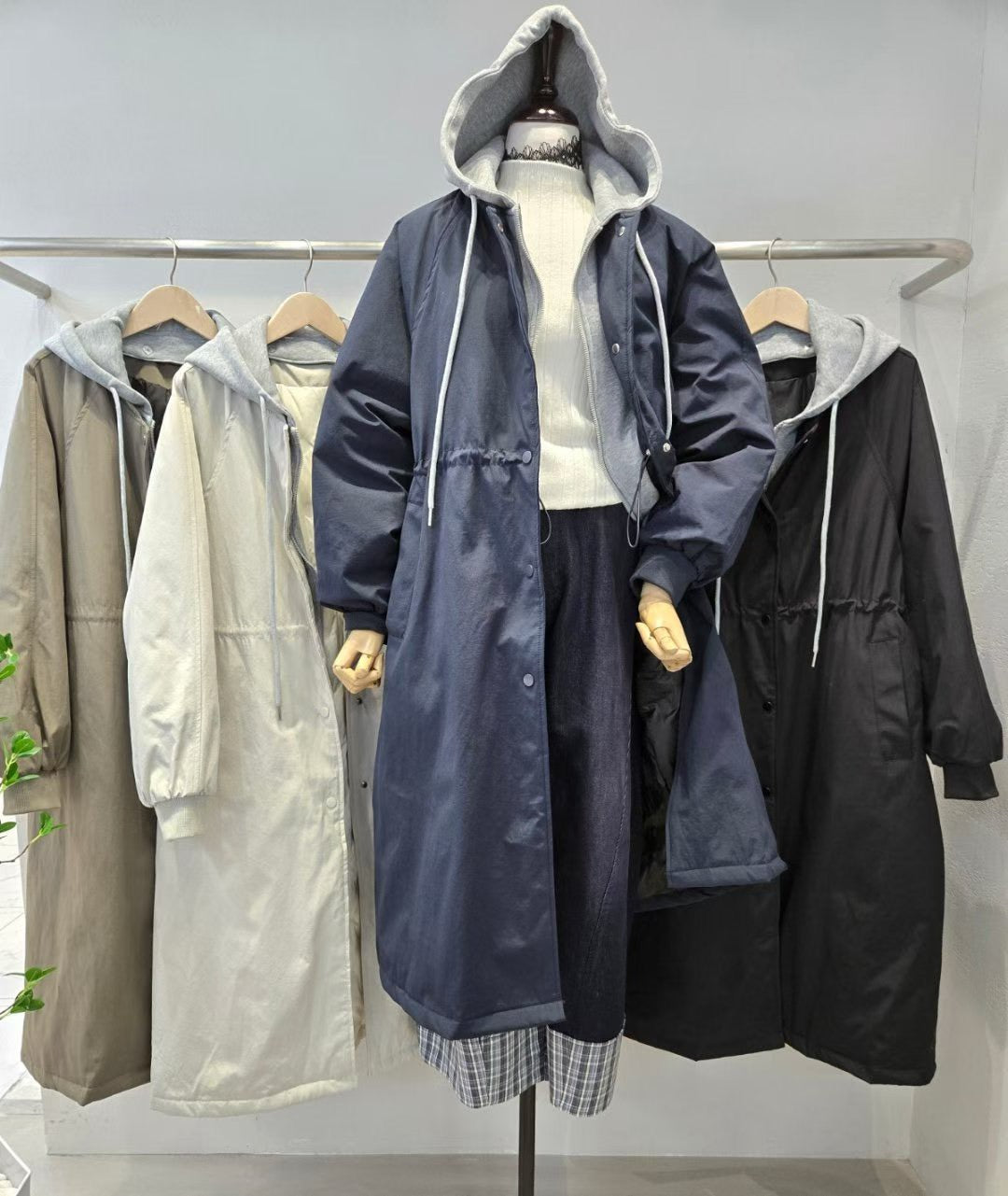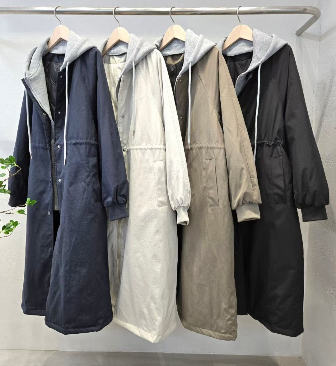 12A208 連帽縮腰過膝長版鋪棉風衣