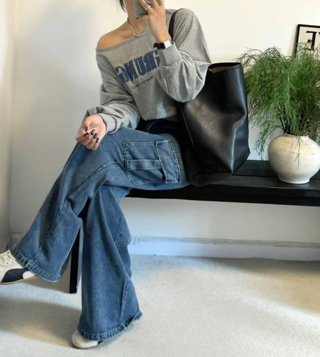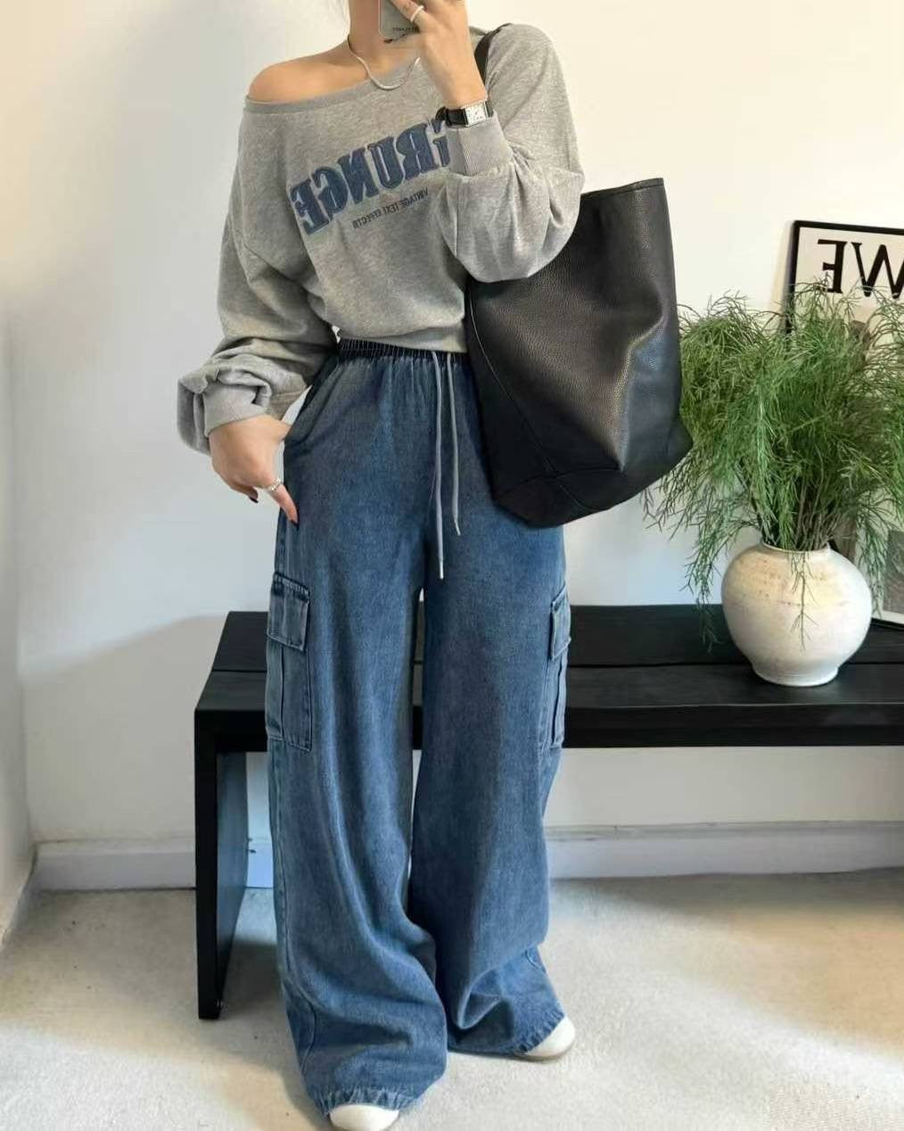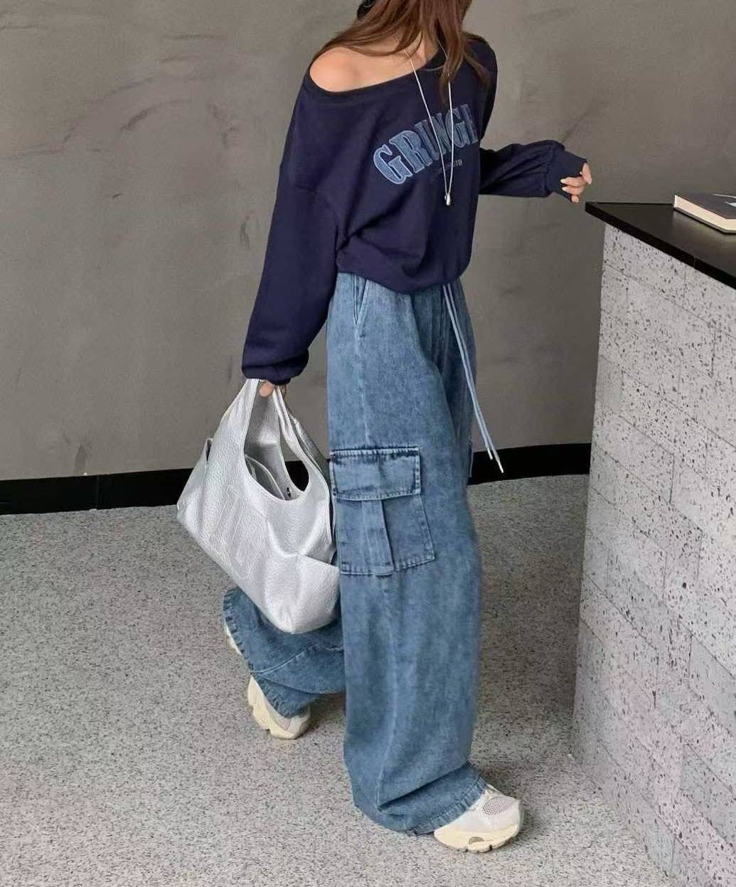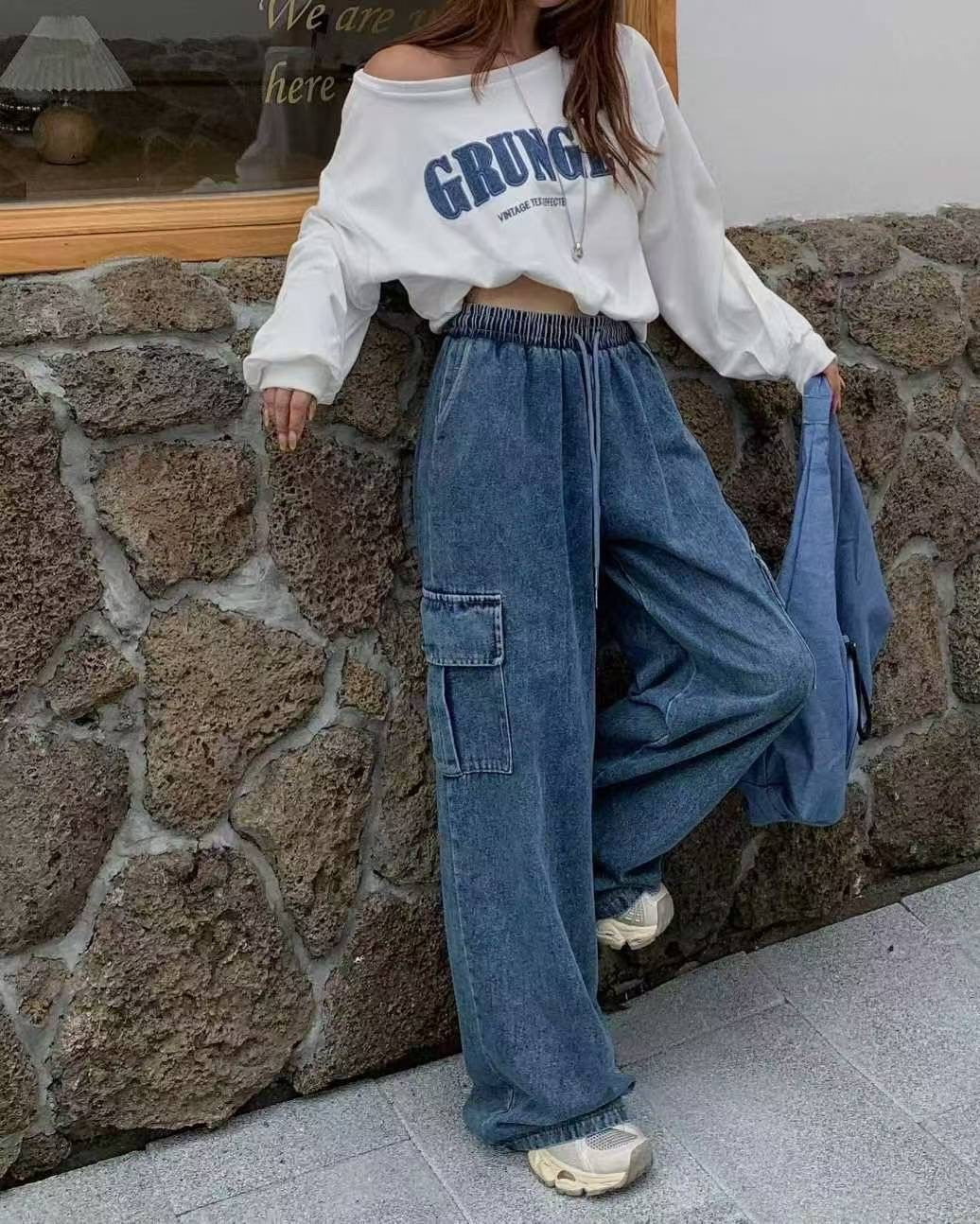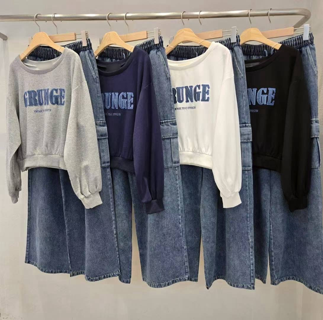 9A105 薄款短版衛衣+鬆緊腰單寧工作褲