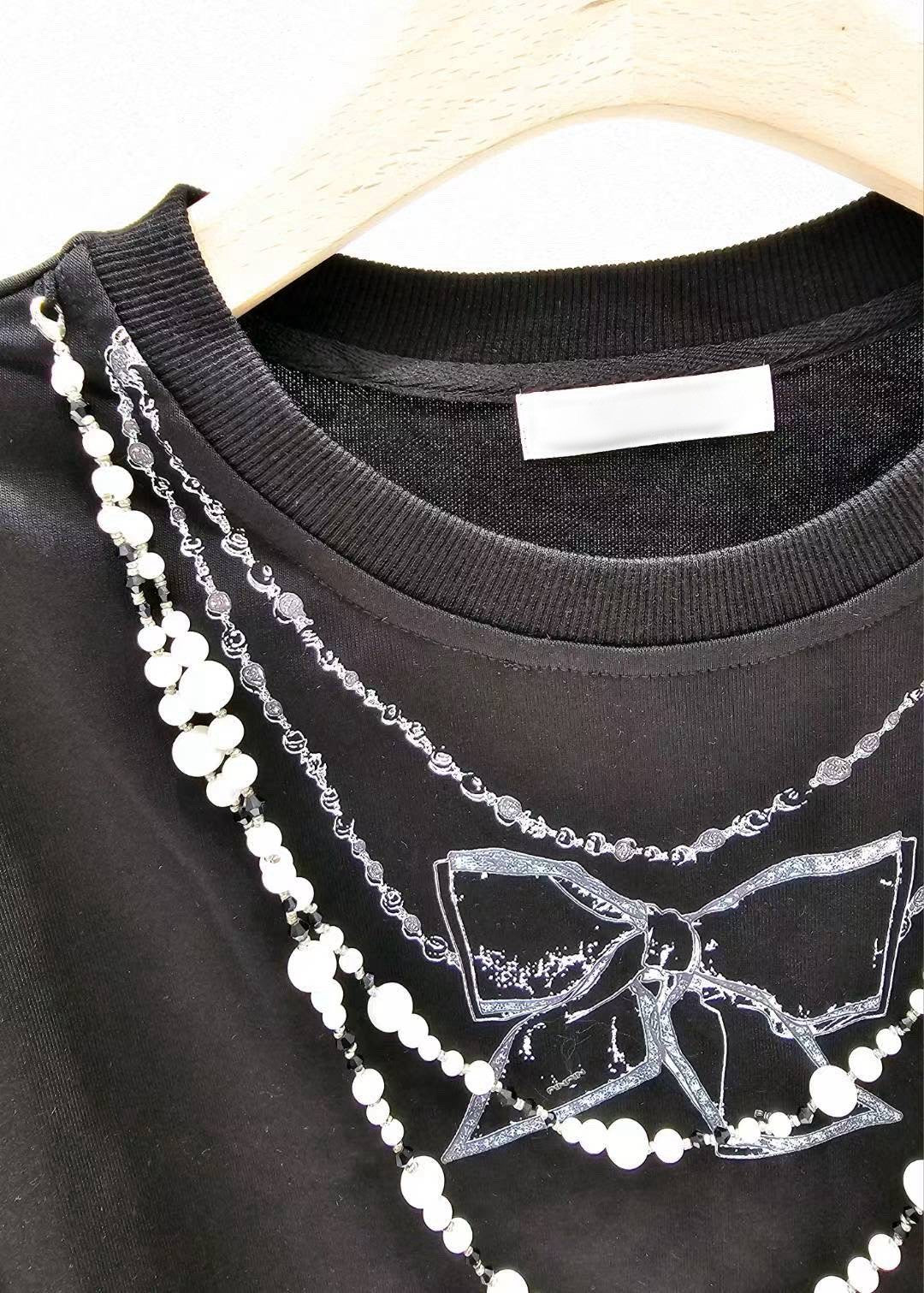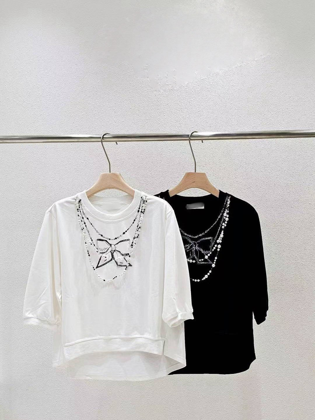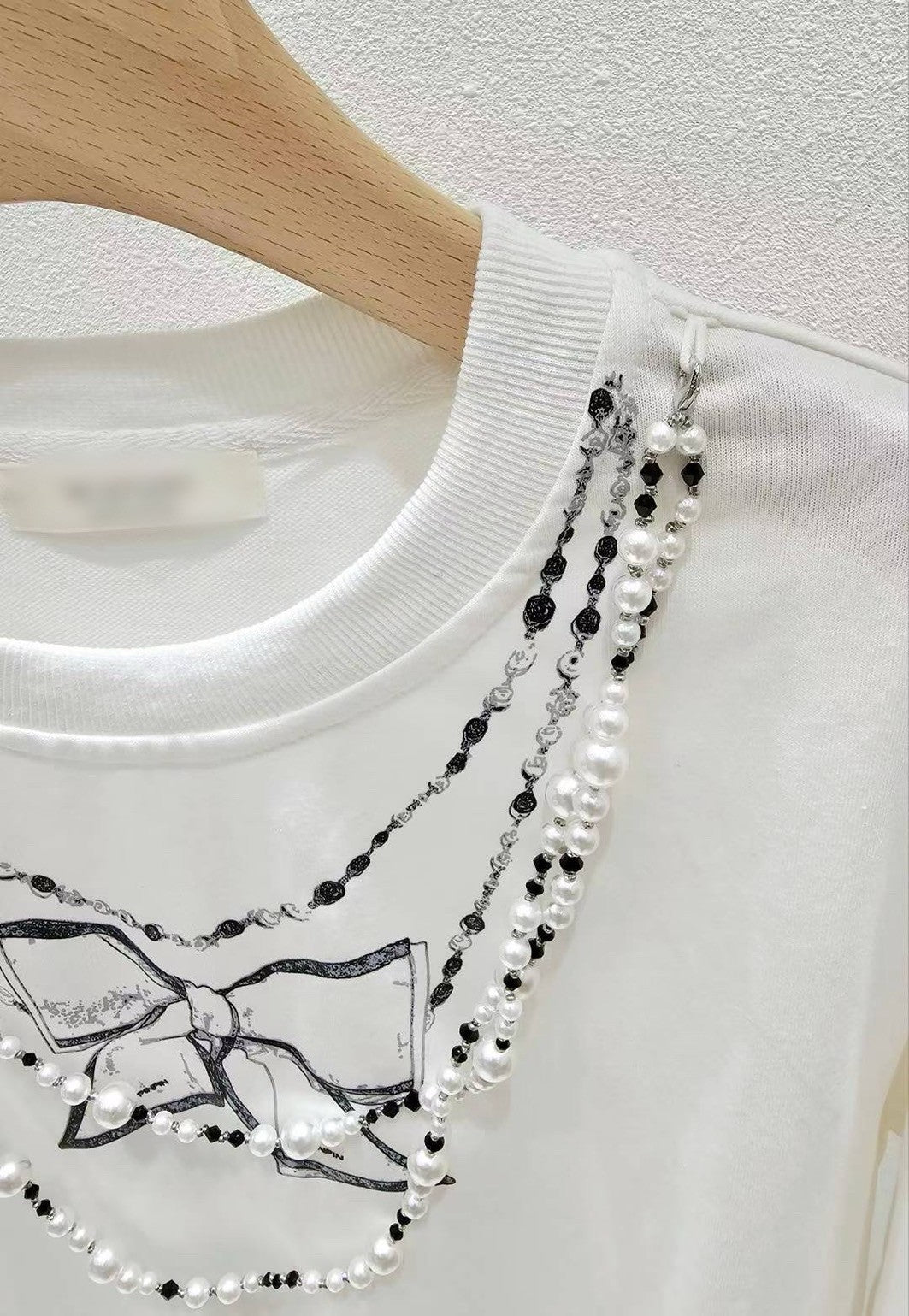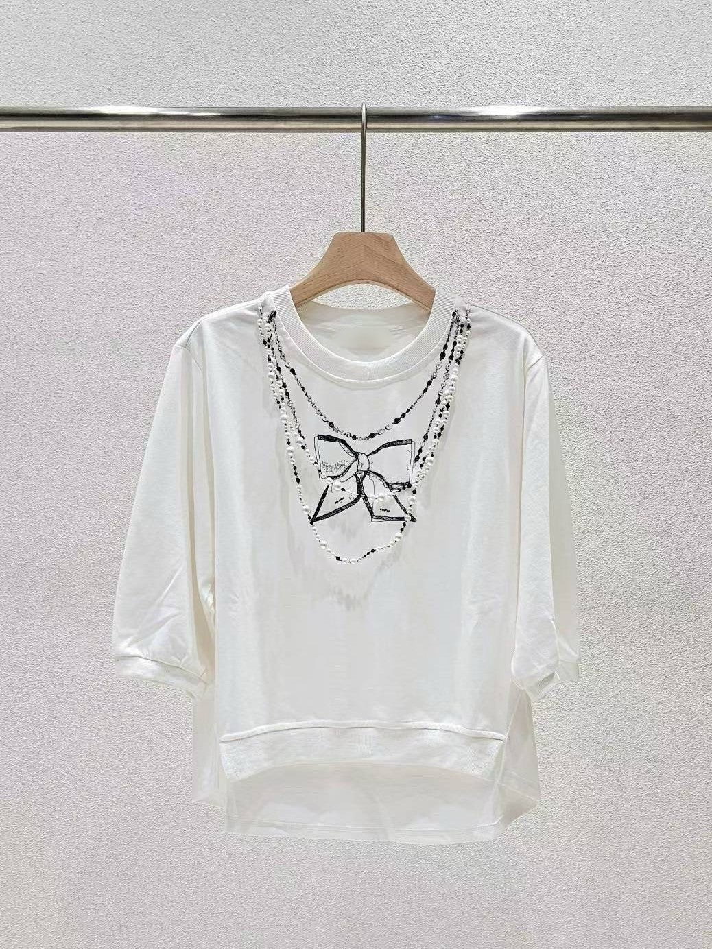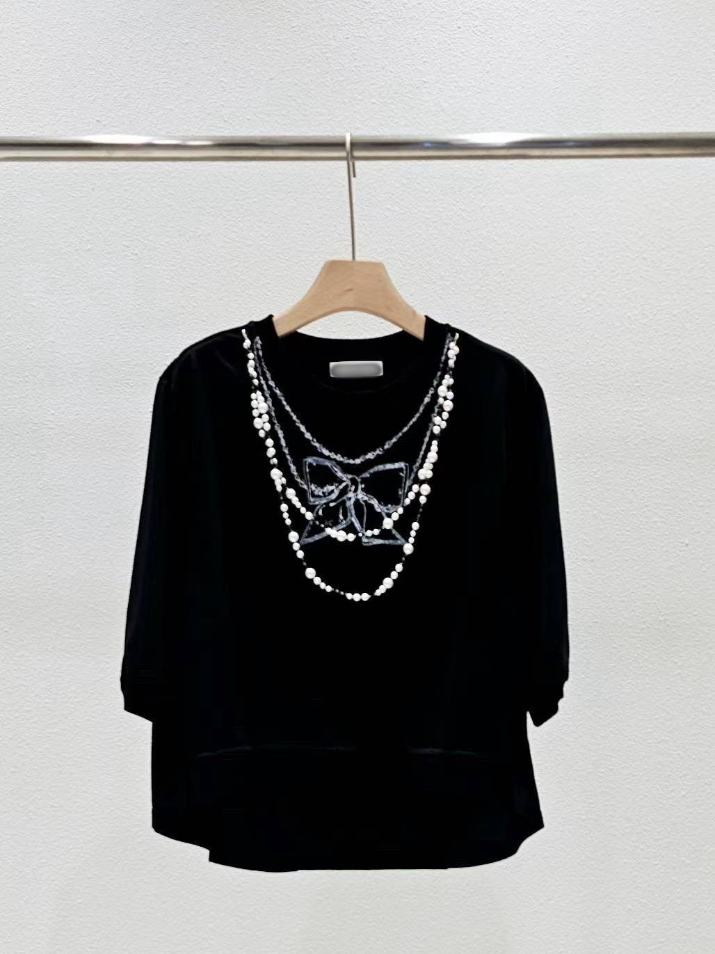 9D102 珍珠項鍊蝴蝶結七分袖棉T